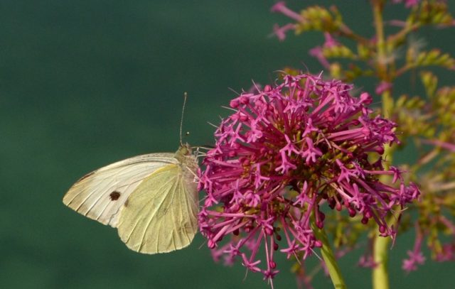 Familia Pieridae: Blanca de la col (Pieris brassicae), en Milamores (Centranthus ruber), en la batería de los Galvanes (Santoña).
