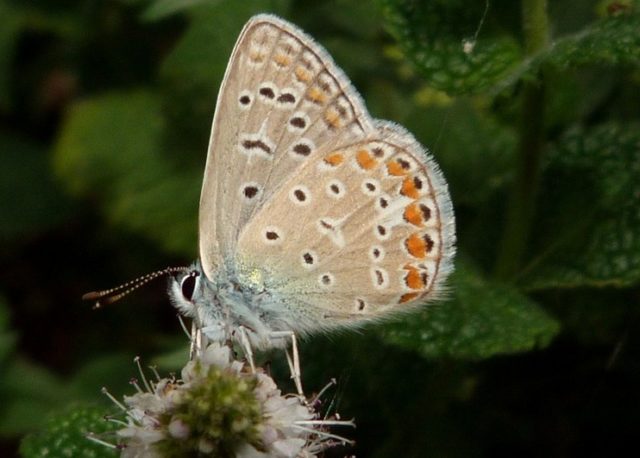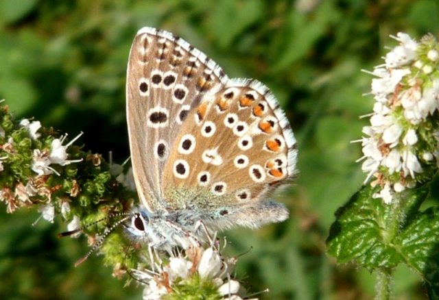 Familia Lycaenidae: Niña celeste (Lysandra bellargus), un macho en una mata de menta (Mentha sp.) en el monte Buciero (Santoña).