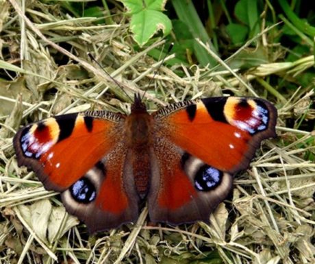 Familia Nymphalidae: Pavo real (Inachis io) sobre vegetación muerta en la Marisma Victoria (Noja).