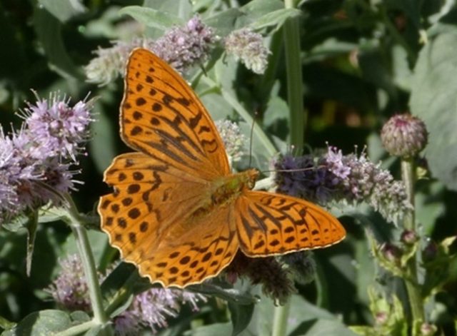 Familia Nymphalidae: Nacarada (Argynnis paphia), un macho sobre menta (Mentha sp.) en un regato de Escalante.