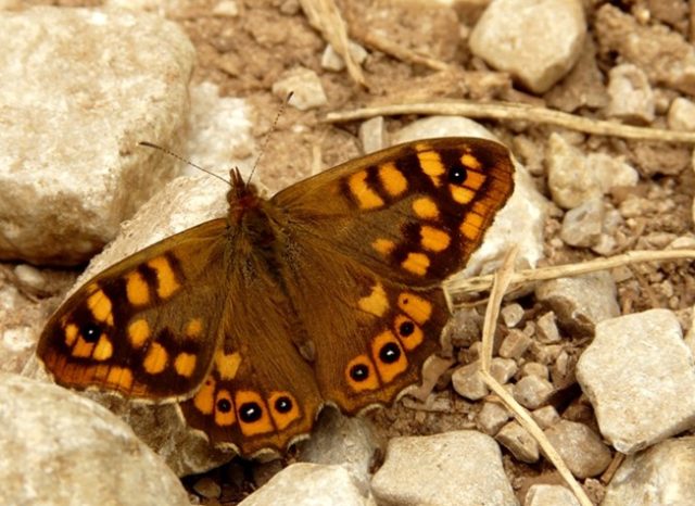 Familia Nymphalidae: Maculada ó Mariposa de los muros (Parage aegeria), un macho sobre un camino pedregoso del monte Buciero (Santoña).