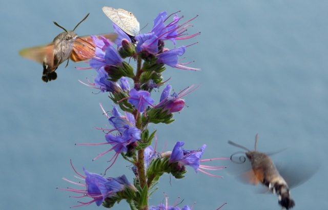 Familia Sphingidae: Esfinge colibrí (Macroglossum stellatarum) libando en Viborera (Echium vulgare) en la Batería de San Felipe (Santoña).